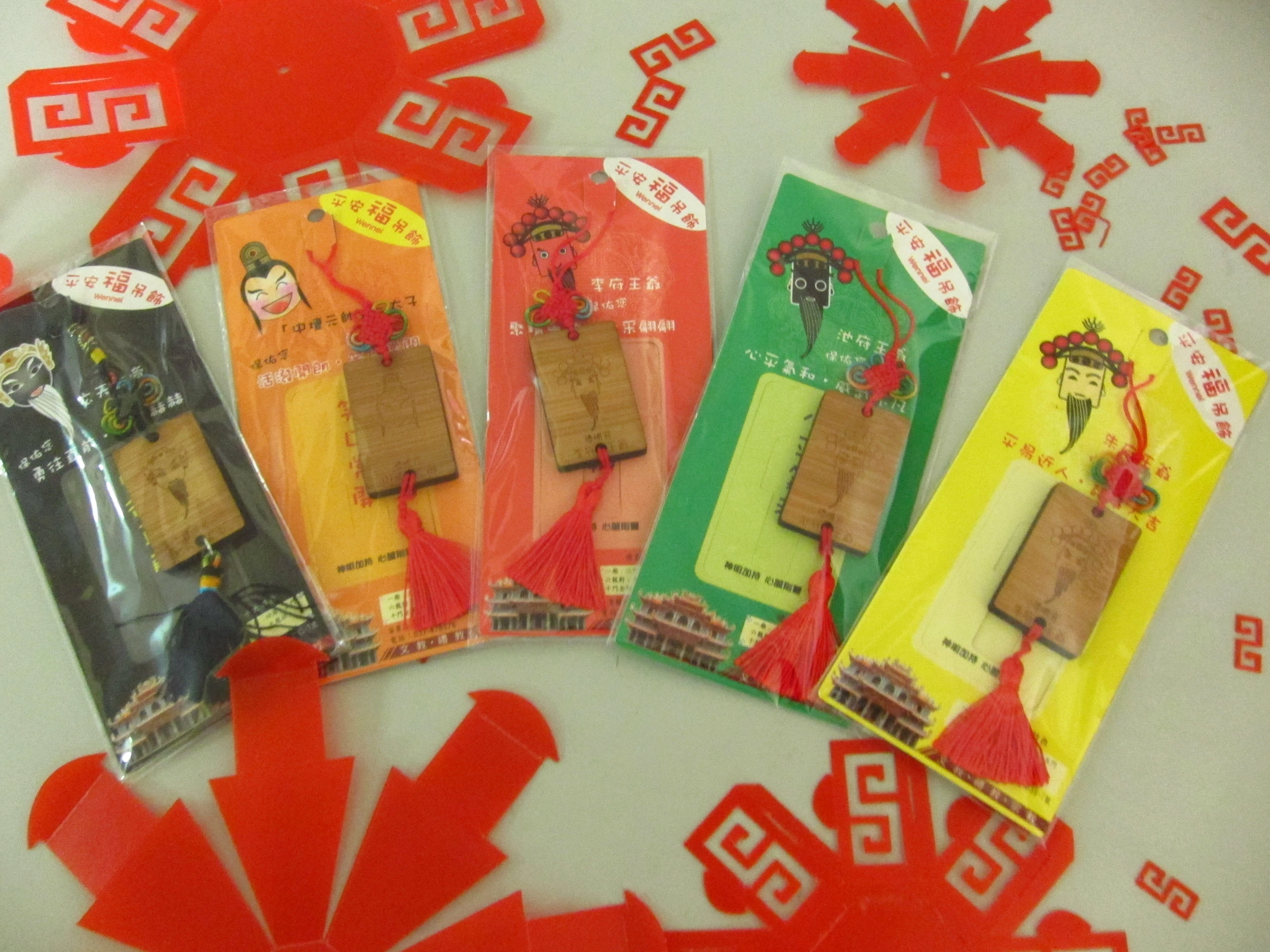 平安福總共有五款,以塭內社區德勝宮的王爺、玄天上帝和中壇元帥為主角,材質:竹